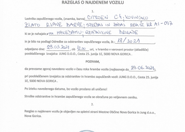 Objavljamo razglas o najdenem vozilu Citroen C4, kovinsko zlato rjave barve. Vozilo je bilo odpeljano v hrambo v naše skladišče.