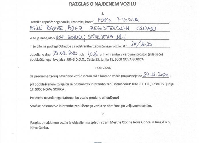 Objavljamo razglas o najdenem vozilu FORD FIESTA, bele barve. Vozilo je bilo odpeljano v hrambo v naše skladišče.