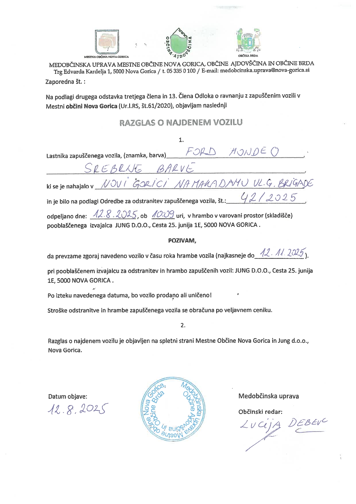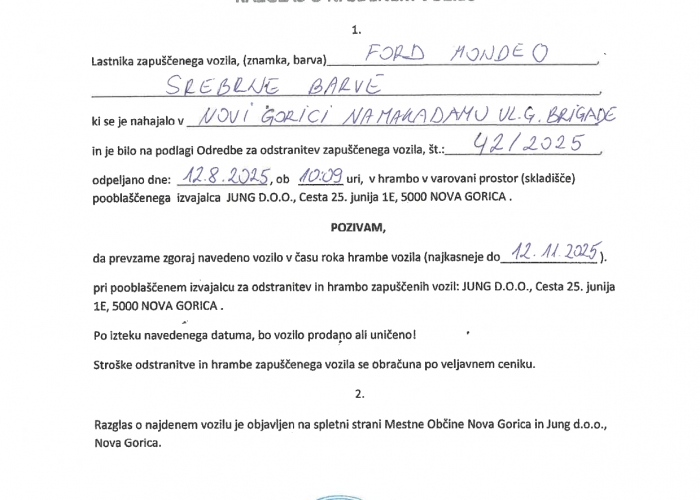 Objavljamo razglas o najdenem vozilu Ford Mondeo srebrne barve. Vozilo je bilo odpeljano v hrambo v naše skladišče.