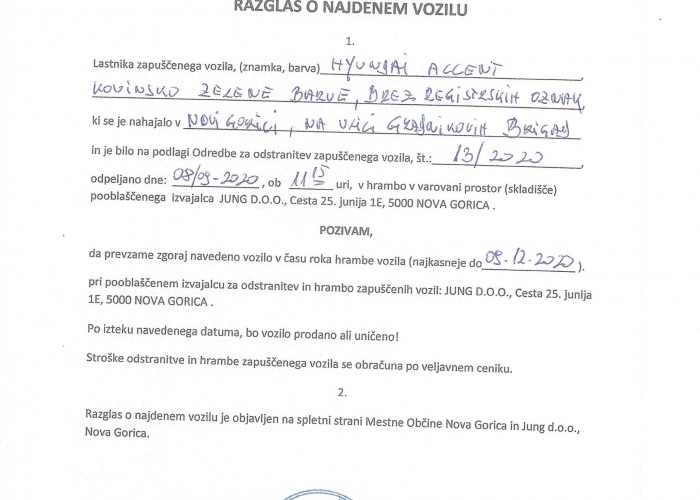 Objavljamo razglas o najdenem vozilu Hyundai Accent, kovinsko zelene barve. Vozilo je bilo odpeljano v hrambo v naše skladišče.