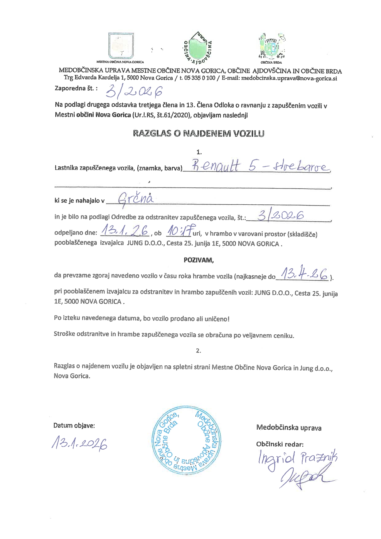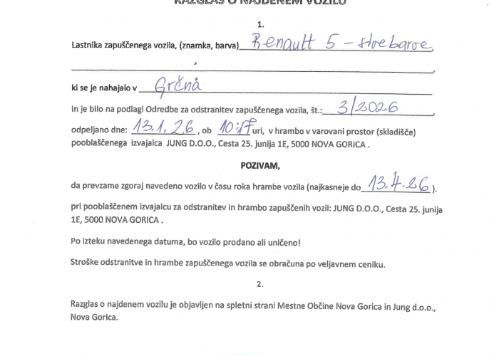 Objavljamo razglas o najdenem vozilu Renault 5 srebrne barve. Vozilo je bilo odpeljano v hrambo v naše skladišče.