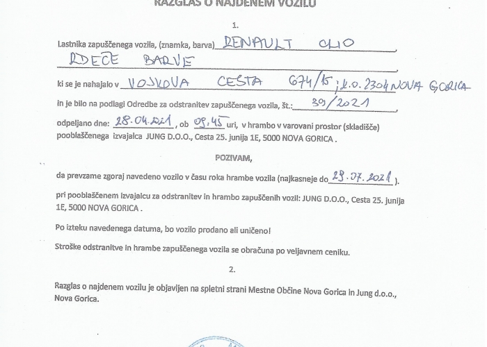 Objavljamo razglas o najdenem vozilu RENAULT CLIO, rdeče barve. Vozilo je bilo odpeljano v hrambo v naše skladišče.