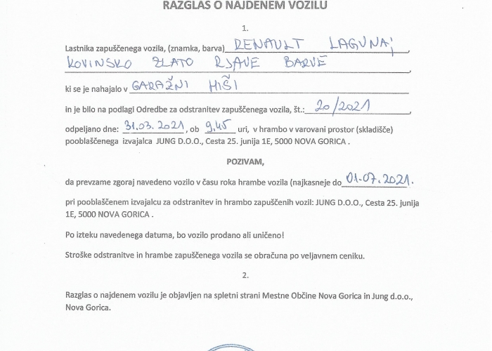 Objavljamo razglas o najdenem vozilu Renault LAGUNA, kovinsko zlato rjave barve. Vozilo je bilo odpeljano v hrambo v naše skladišče.